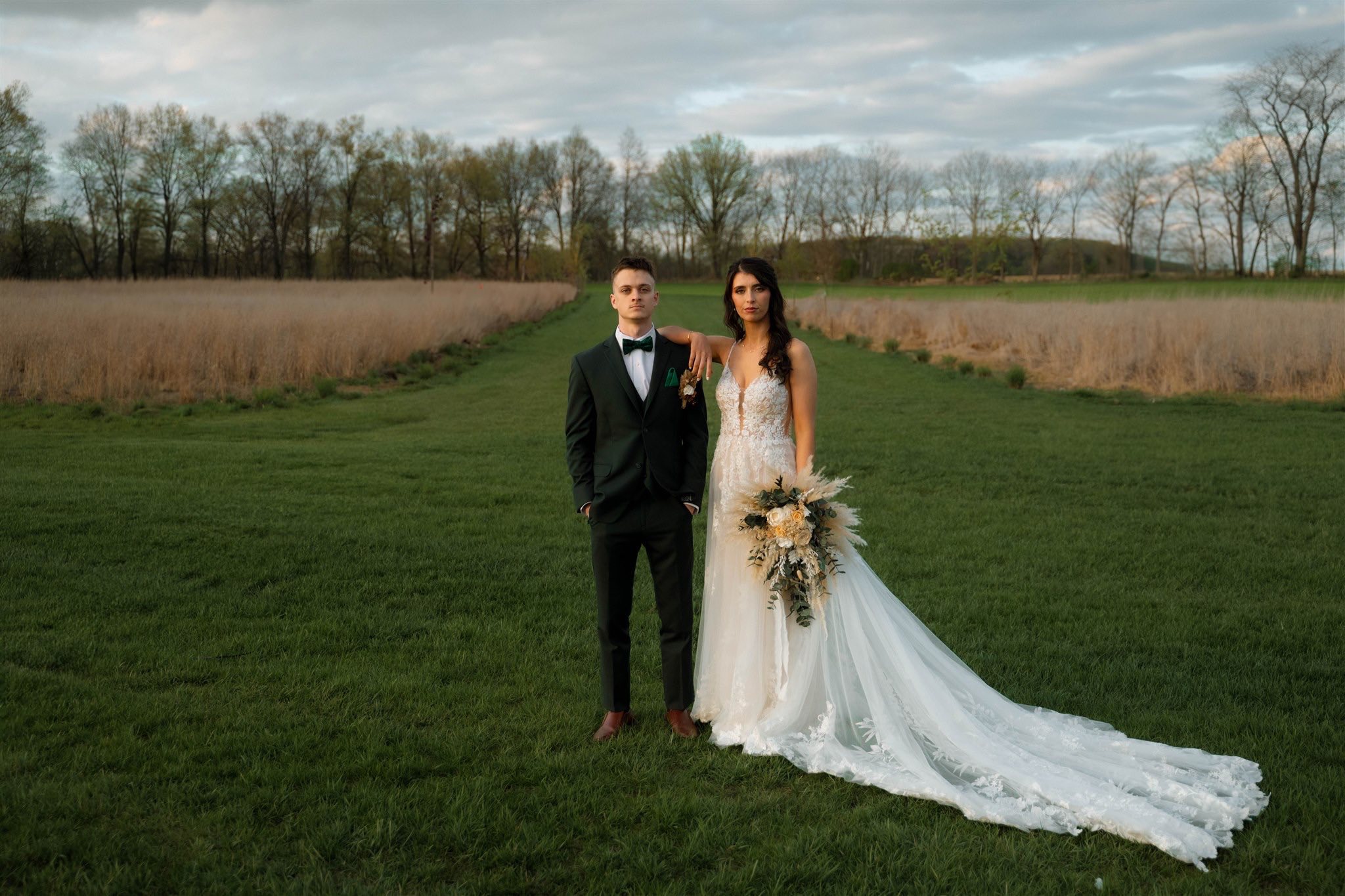 Drew brought contrast and polish in a deep green suit, finished with a subtly floral-patterned green bowtie and matching pocket square. A modern, bold look that beautifully complemented the palette.